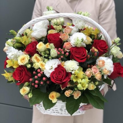 Цветы в коробке с гортензией,пион розами,матиолой,альстромерией,эустомой,колосьями пшеницы и эвкалиптом