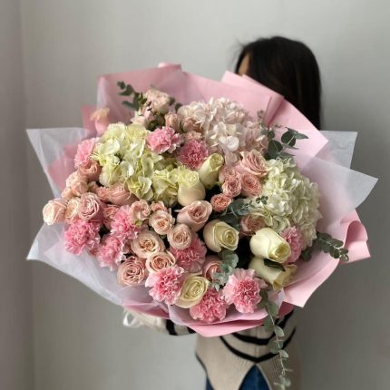 Цветы в большой коробке: садовые розы, лизиантус, маттиола, тюльпаны