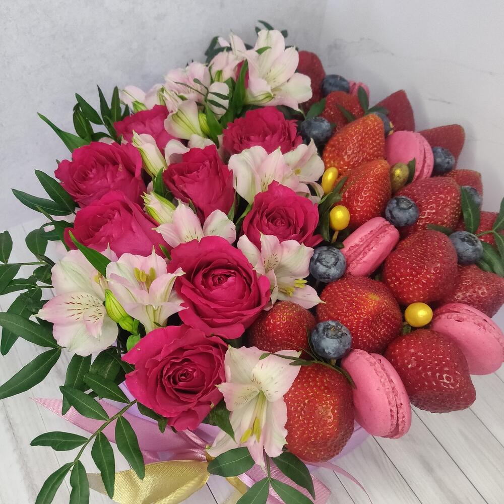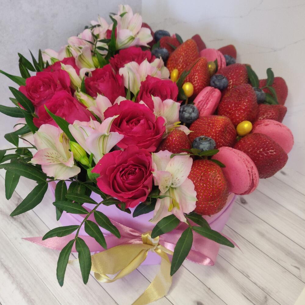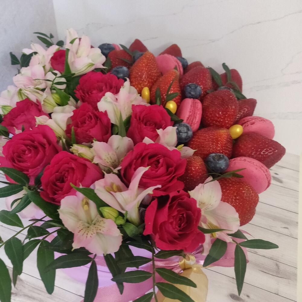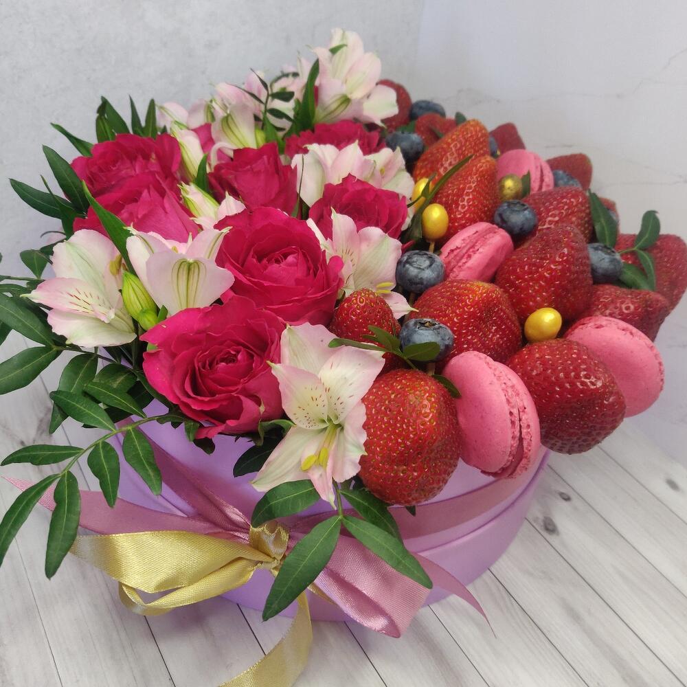 Альстромерия – 5 шт.Клубника – 666 гр.Шляпная коробка – 1 шт.розы – 9 шт.