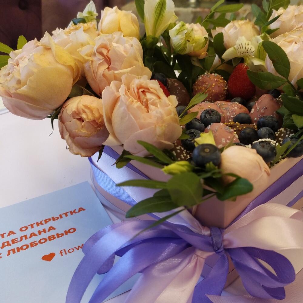 Альстромерия – 3 шт.Упаковка дизайнерская – 1 шт.Фисташка пучок – 1 шт.Коробка сердце большая – 1 шт.Голубика 100гр – 1 шт.Клубника в шоколаде callebaut (бельгия) – 25 шт.розы кустовые микс – 5 шт.