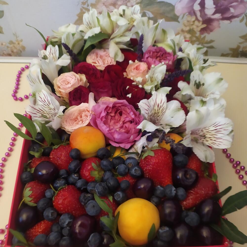 Альстромерия – 6 шт.Клубника – 250 гр.Киви – 300 гр.Коробка подарочная – 1 шт.Хурма – 500 гр.Фисташка пучок – 2 шт.Голубика 100гр – 1 шт.розы красные 50 см – 5 шт.розы кустовые микс – 3 шт.абрикосы – 300 гр.
