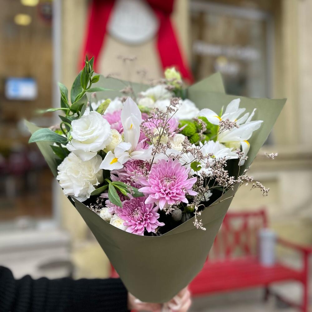 white eustoma – 2 шт. pink chrysanthemum – 2 шт. Green chrysanthemum – 3 шт. white chrysanthemum – 2 шт. spray rose pink – 2 шт. dried limonium – 2 шт.