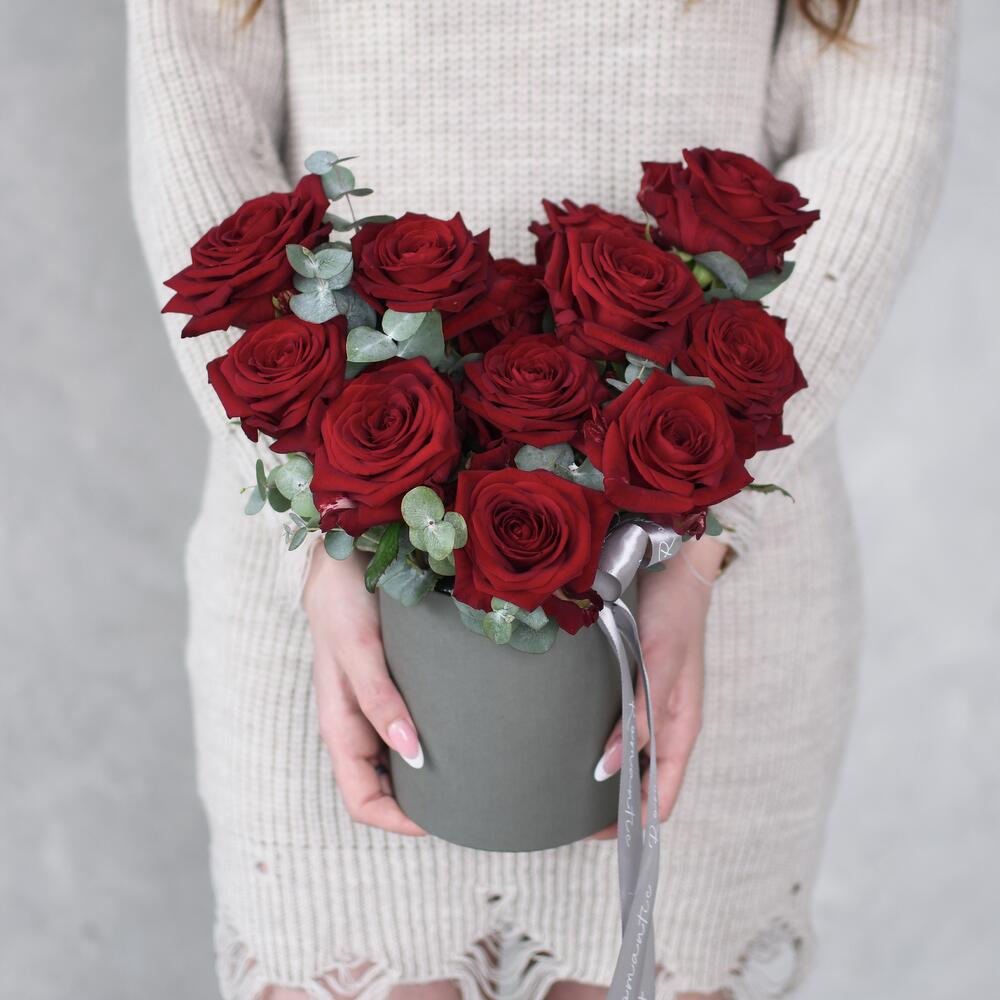 розы красные – 15 шт.Эвкалипт – 7 шт.Коробка шляпная – 1 шт.