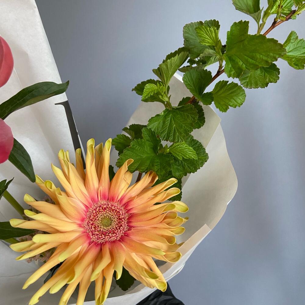 Пион – 2 шт.Гербера – 1 шт.Ранункулюс – 1 шт.ветка декоративная – 1 шт.Упаковка дизайнерская – 1 шт.инструкция по уходу за цветами – 1 шт.