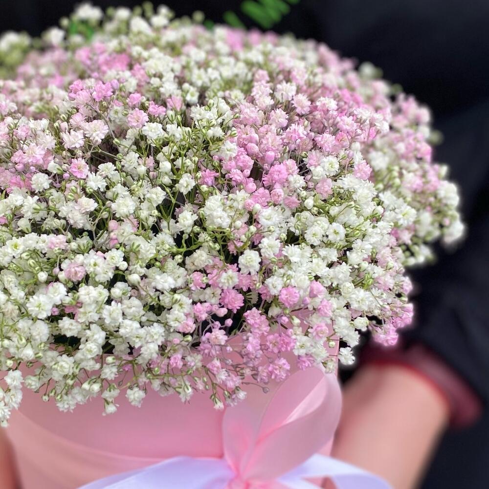 Букет из бело-розовых гипсофил в шляпной коробке