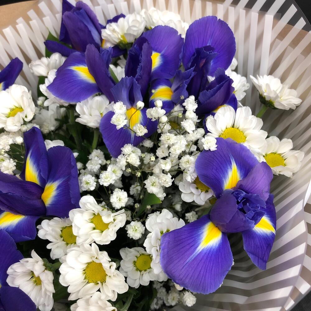 Сантини – 5 шт.Ирис – 7 шт.Гипсофила – 1 шт.Рускус – 5 шт.Крафт – 1 шт.