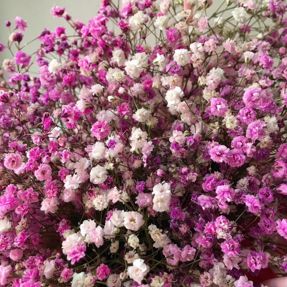 гипсофилы цветные – 6 шт.Оазис флористический – 1 шт.тишью розовое – 1 шт.Сумочка – 1 шт.Лента атласная – 2 шт.