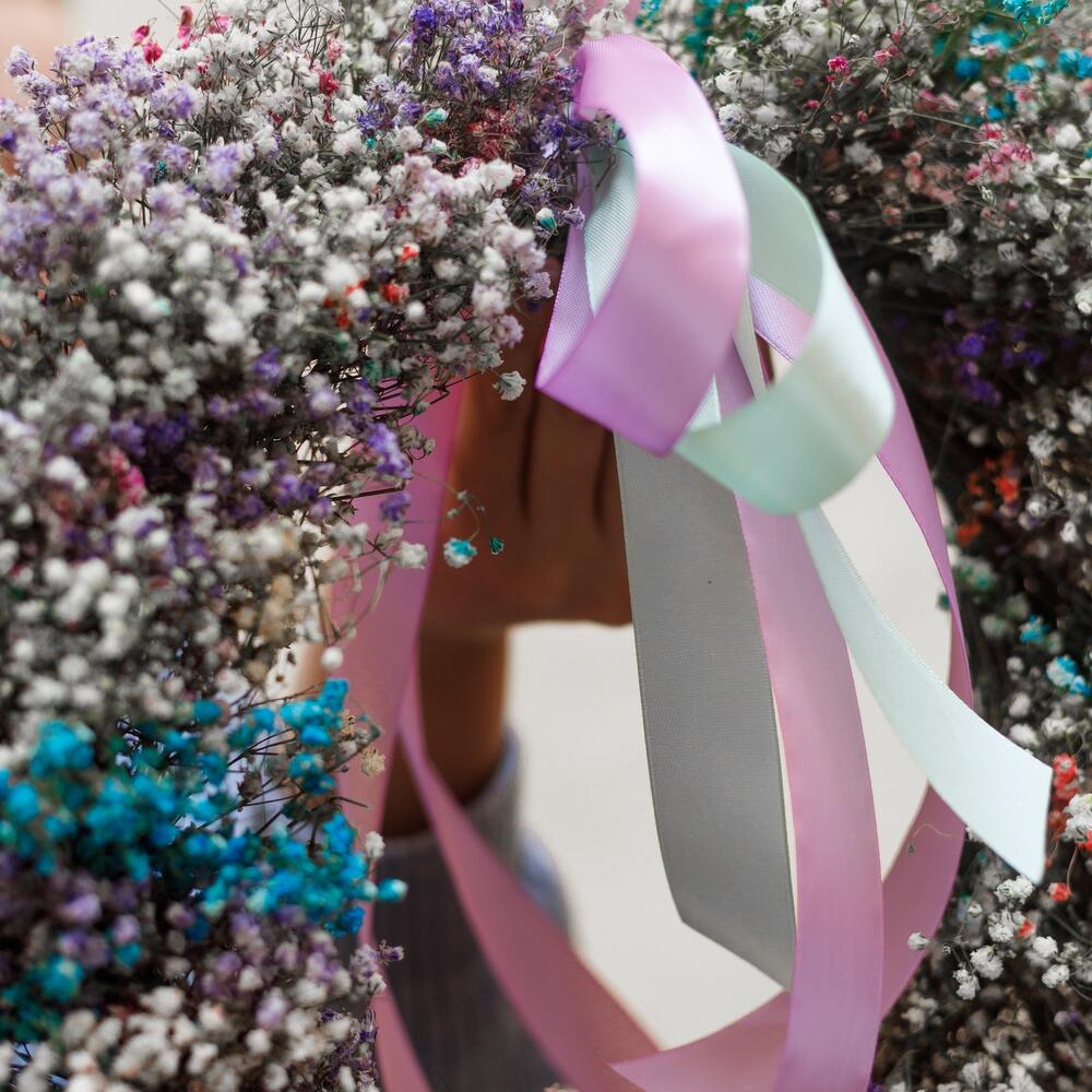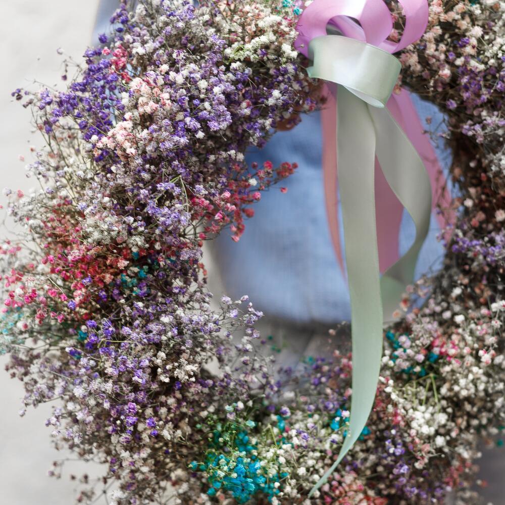 гипсофила сухая – 35 шт.основа венок – 1 шт.Лента атласная – 2 шт.Упаковка транспортировочная пленка – 1 шт.