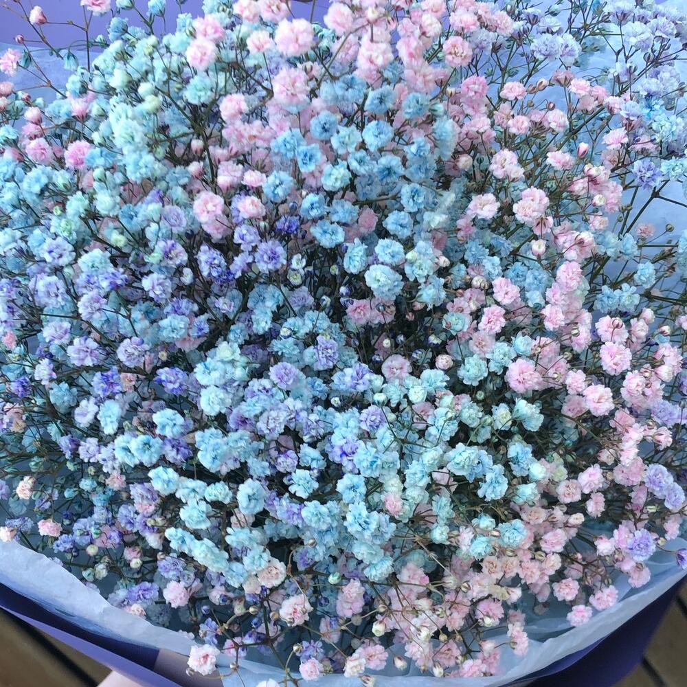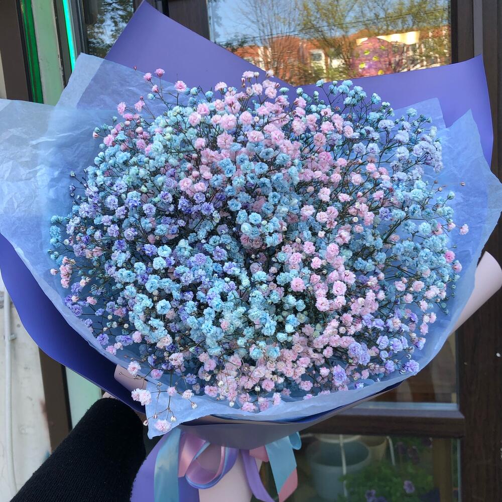 Лента атласная – 3 шт.Тишью – 2 шт.гипсофила цветная – 5 шт.пленка матовая градиент – 5 шт.