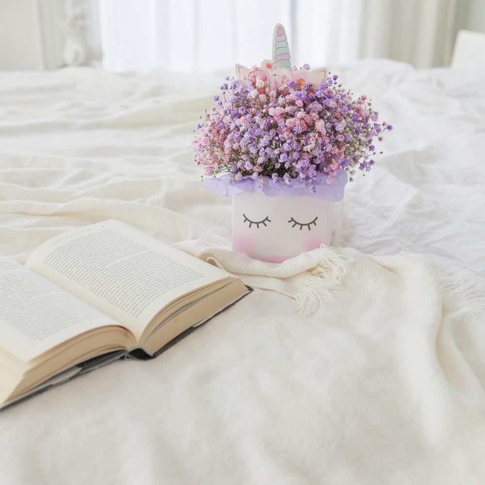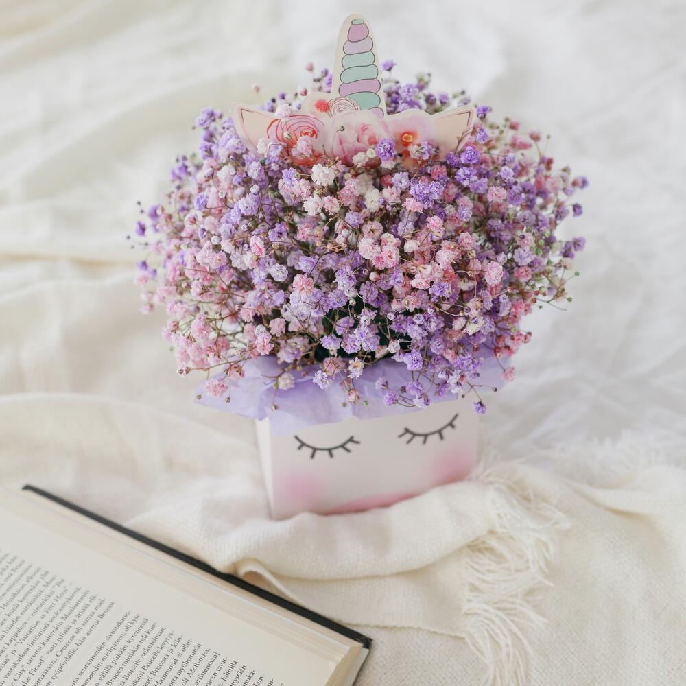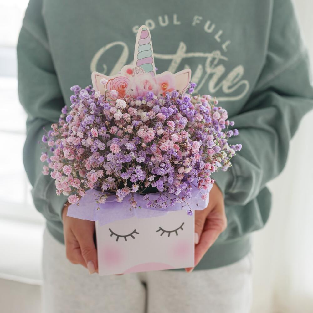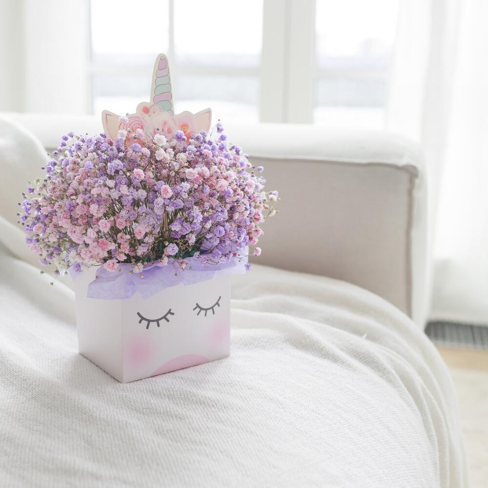 гипсофила цветная – 5 шт.коробка единорог – 1 шт.Тишью – 4 шт.Лента атласная – 1 шт.Оазис флористический – 1 шт.Упаковка транспортировочная пленка – 1 шт.