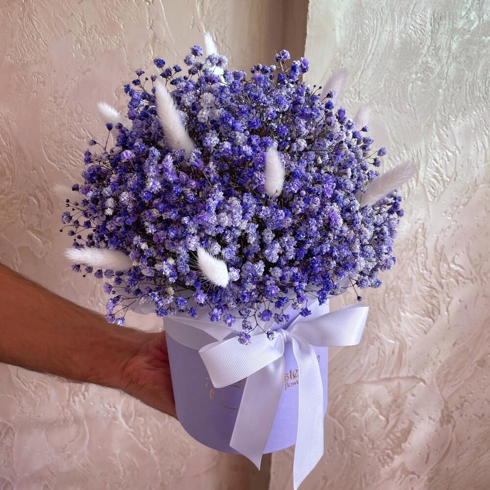 Гипсофила – 7 шт. Лагурус – 11 шт. Оазис флористический – 1 шт. Лента репсовая – 1 шт. коробка шляпная d15 – 1 шт.