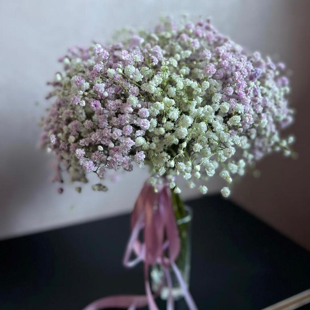 гипсофила белая – 5 шт.Гипсофила фиолетовая – 4 шт.Атласная лента – 1 шт.открытка с правилами ухода за свежими цветами – 1 шт.