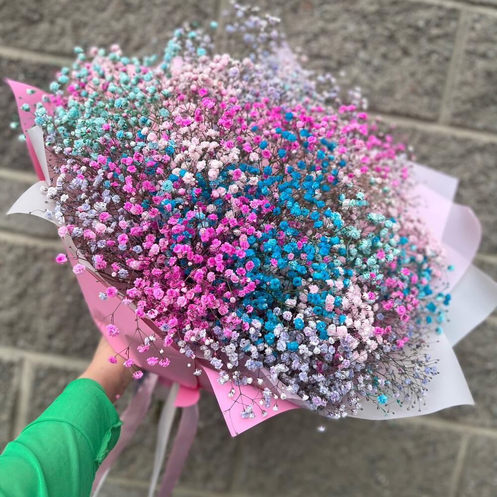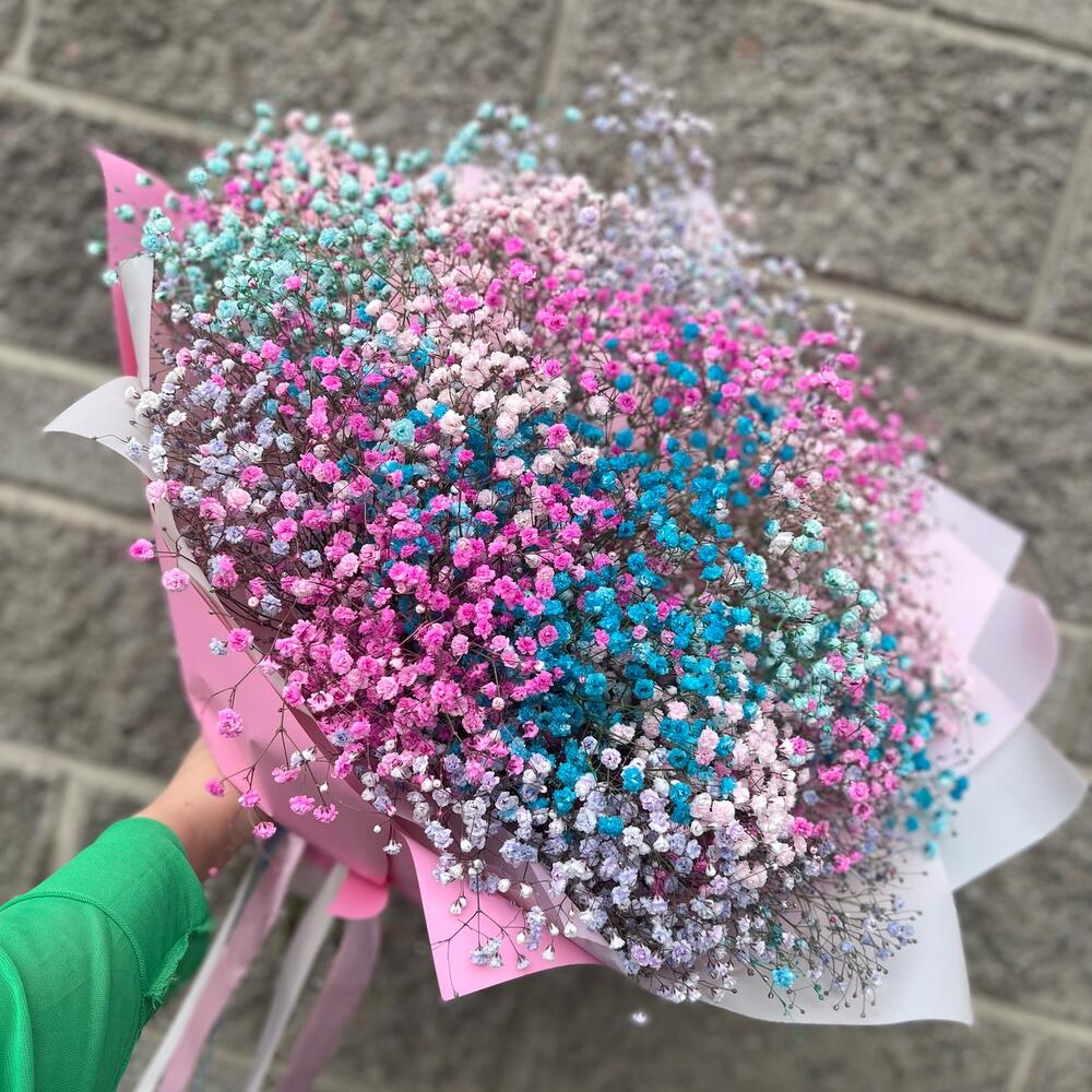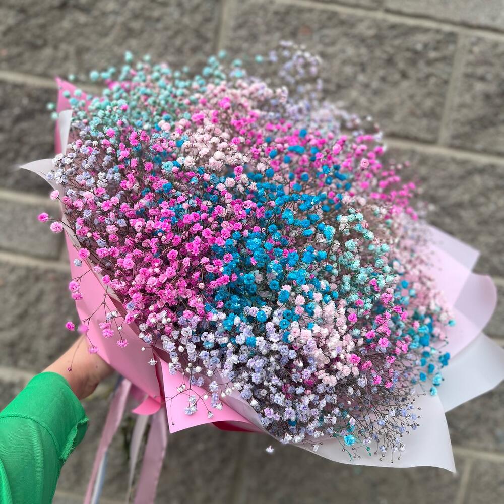 гипсофила радужная – 9 шт.Упаковка дизайнерская – 5 шт.Лента атласная – 3 шт.