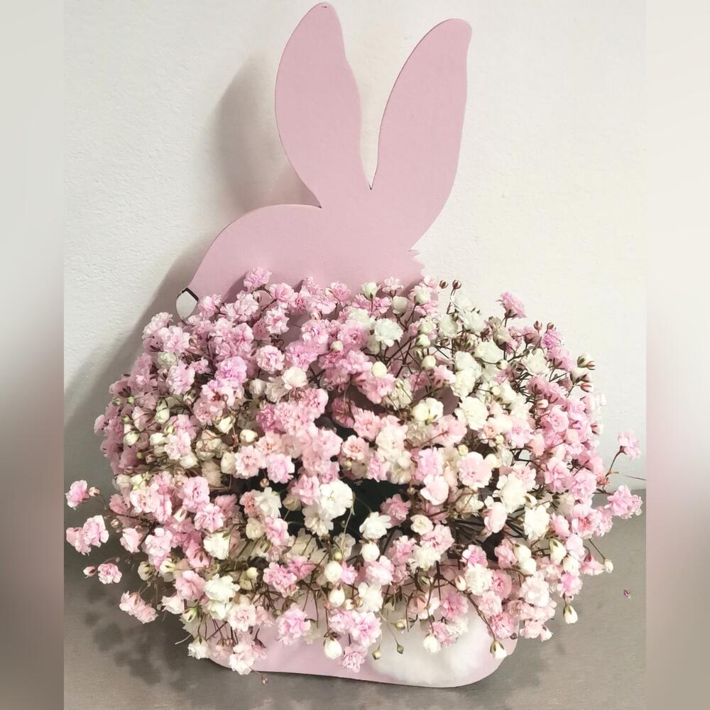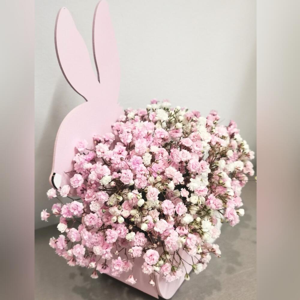 Оазис флористический – 1 шт.гипсофила розовая и белая – 4 шт.ящик “зайка розовый” – 1 шт.