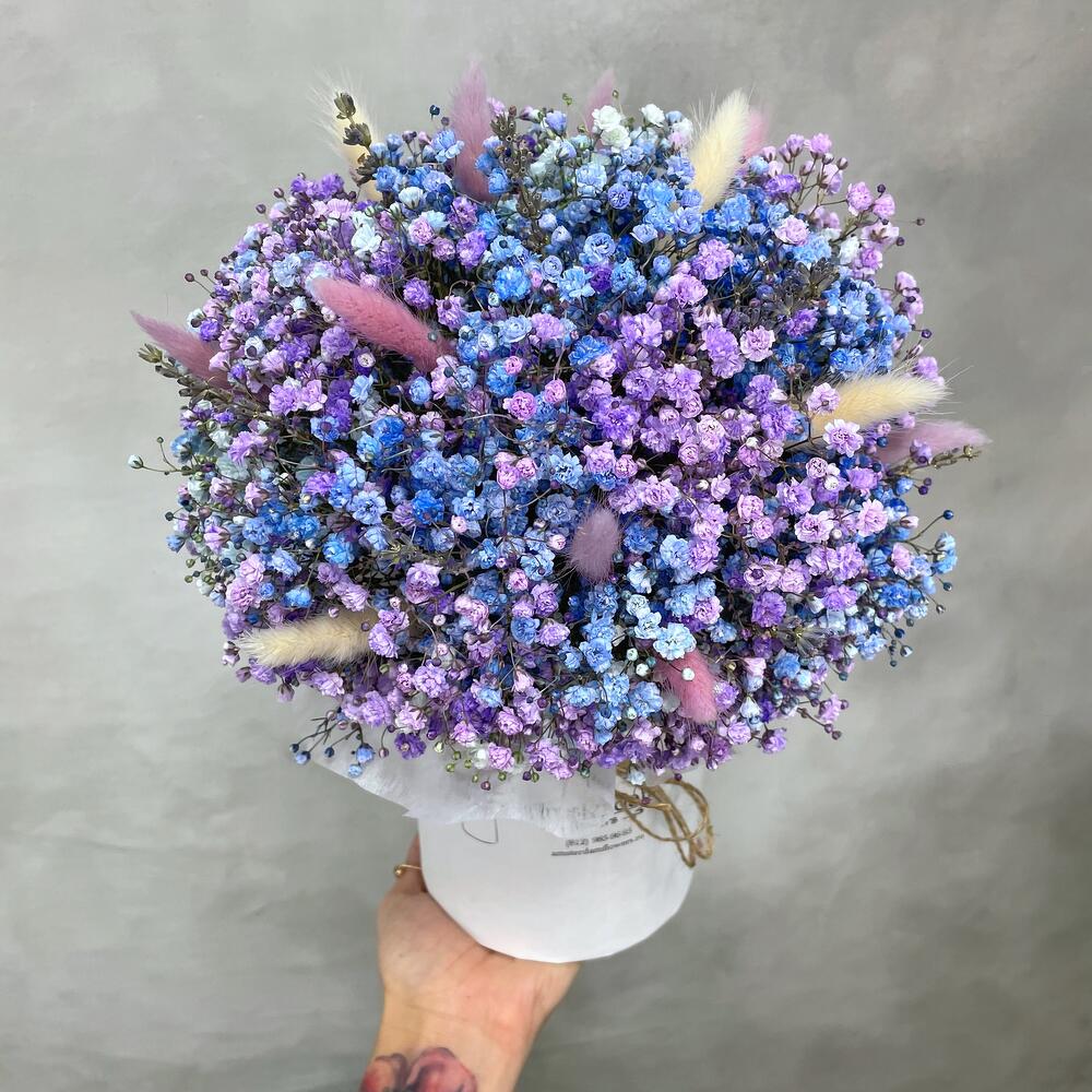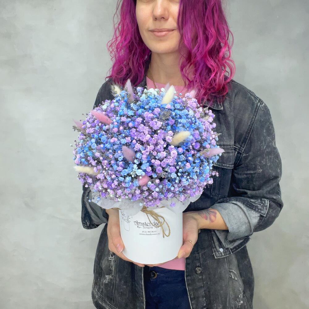 Букетик гипсофилы в "космических" оттенках. Это настоящее наслаждение цветом. Композиция дополнена хвостиками лагуруса, что добавляет ей современности, стиля и разнообразия. Такой подарок удивит даже самую требовательную особу.