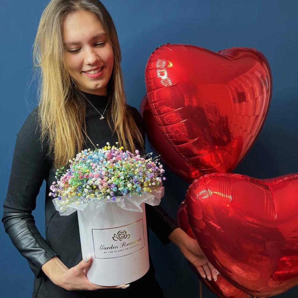 Шляпная коробка – 1 шт.Флористическая губка (оазис) – 1 шт.гипсофила радужная – 11 шт.воздушный шар сердце – 1 шт.