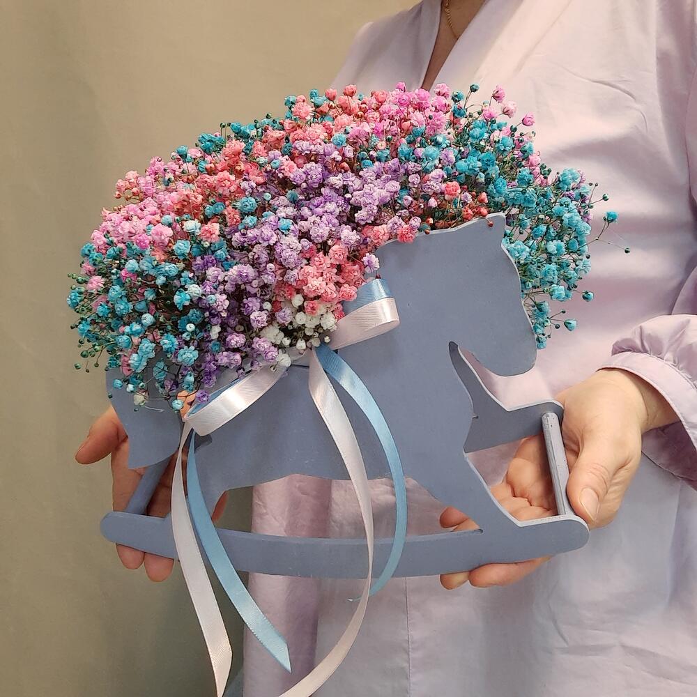 гипсофила радужная – 7 шт.Оазис флористический – 1 шт.Ящик деревянный – 1 шт.Лента атласная – 2 шт.