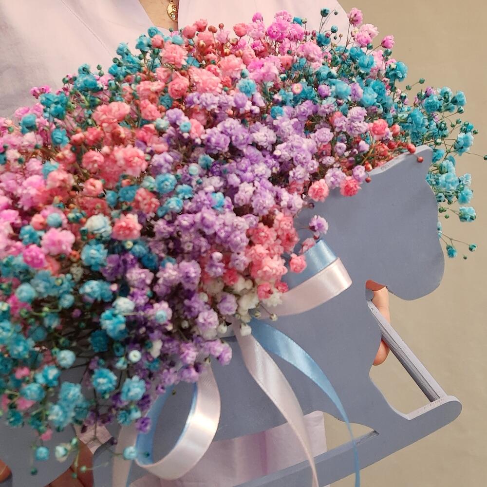 Композиция с радужной гипсофилой в декоративном ящике