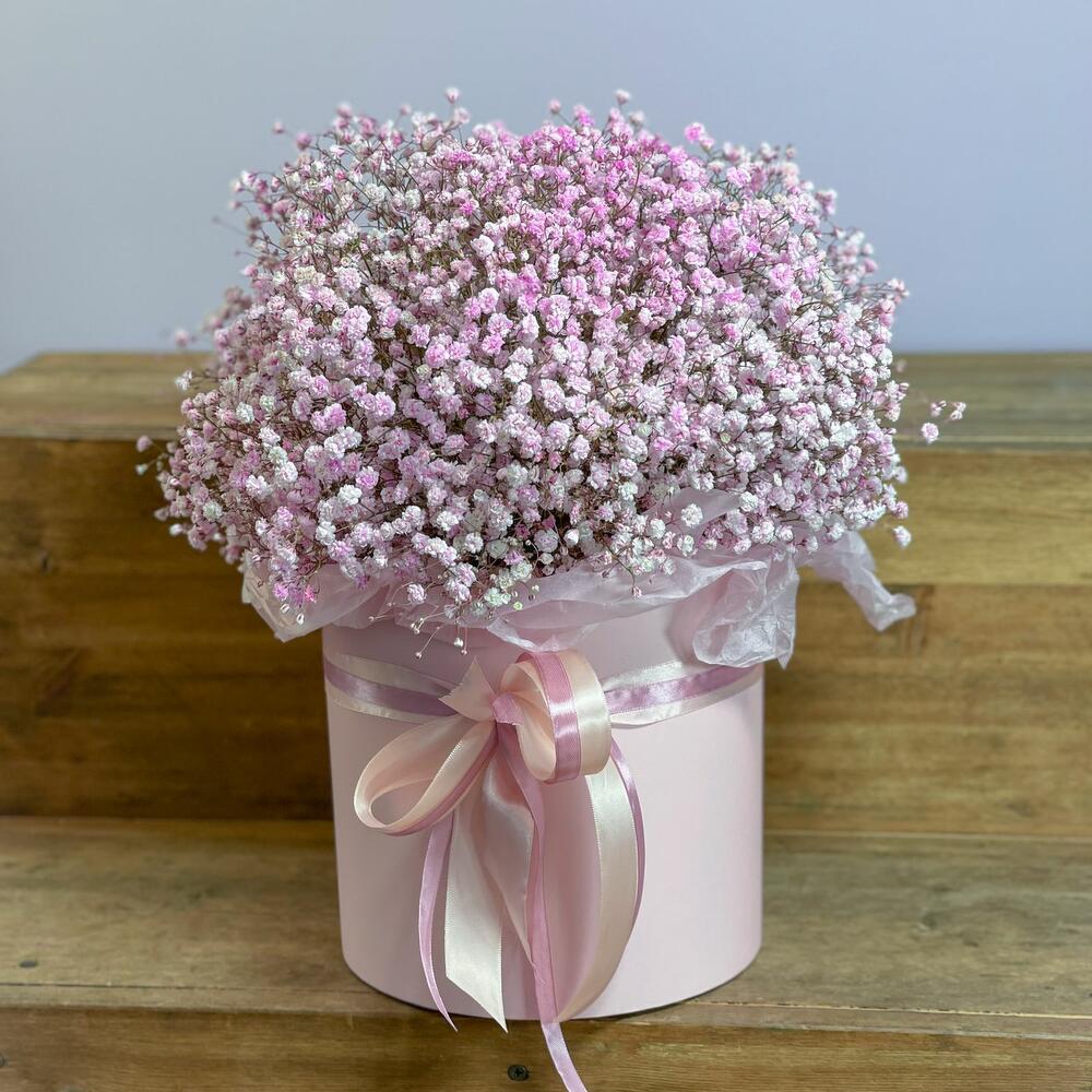 “Сиреневый туман” – композиция из гипсофилы в шляпной коробке