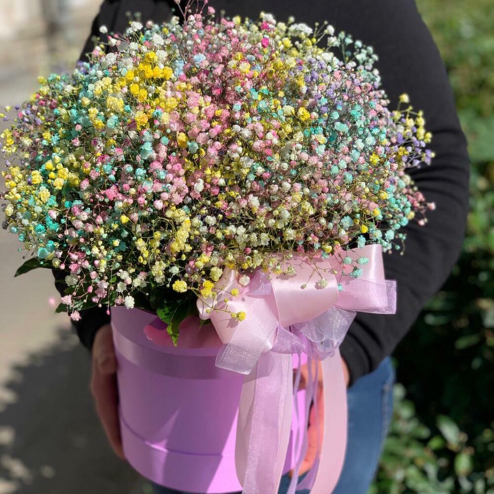 гипсофила радужная – 10 шт.Коробка – 1 шт.Лента атласная – 2 шт.Оазис флористический – 1 шт.Итальянский рускус – 3 шт.