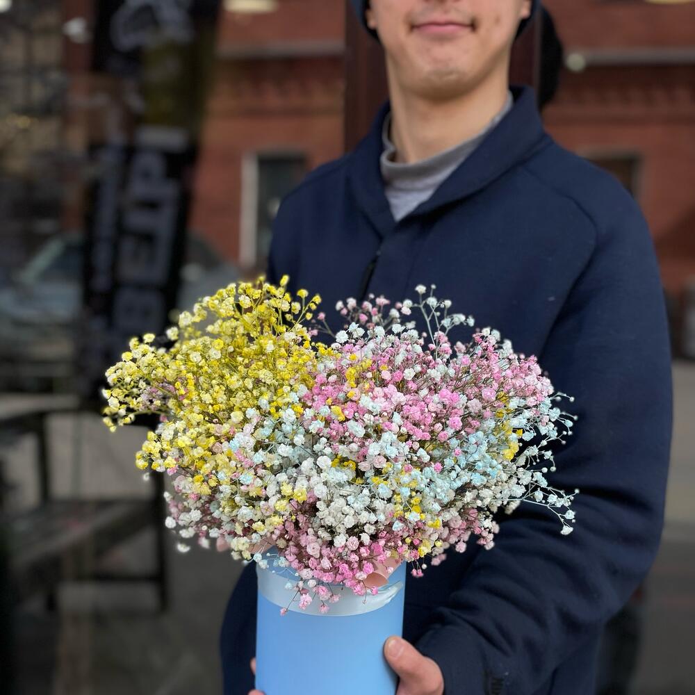 гипсофила микс – 7 шт.шляпная коробочка с лентами – 1 шт.