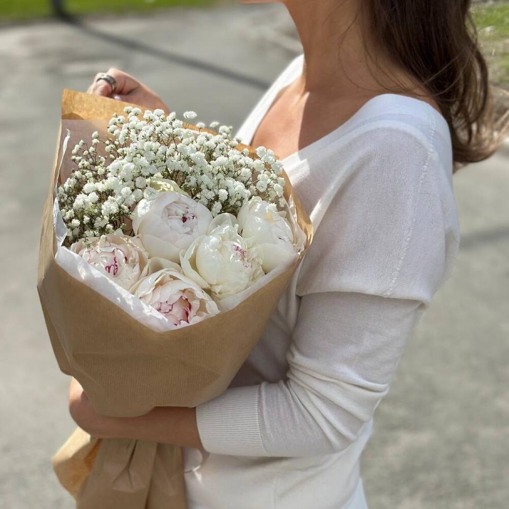 Подарочная упаковка – 1 шт.Средство для продления жизни цветов – 1 шт.пионы италия – 5 шт.гипсофила белая premium – 2 шт.