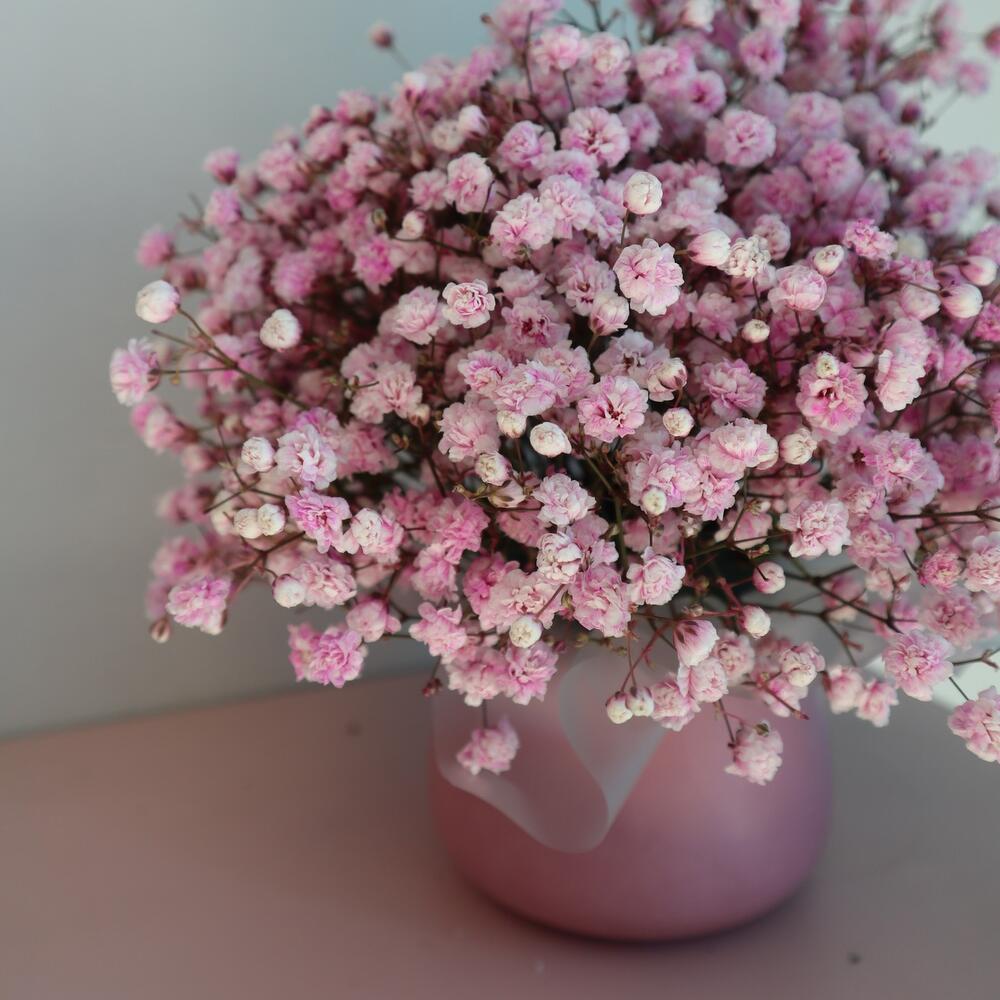 Гипсофила розовая – 4 шт.кашпо керамика ручной работы – 1 шт.Флористическая губка (оазис) – 1 шт.Матовая пленка – 1 шт.