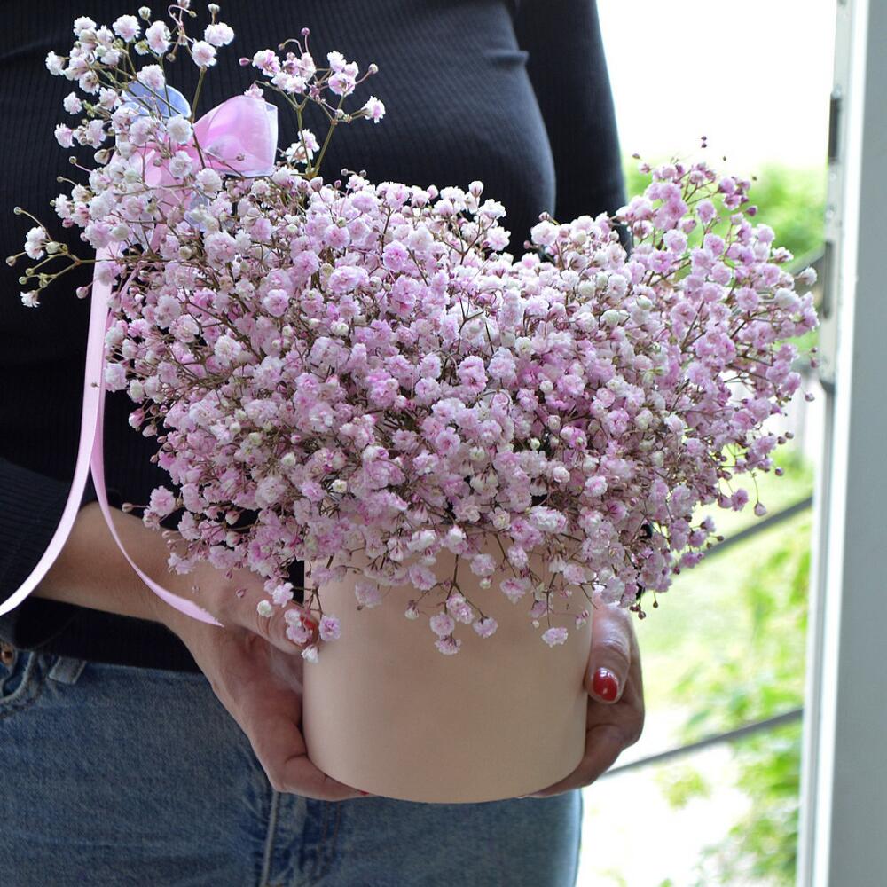 “Сиреневый туман” – композиция из гипсофилы в шляпной коробке