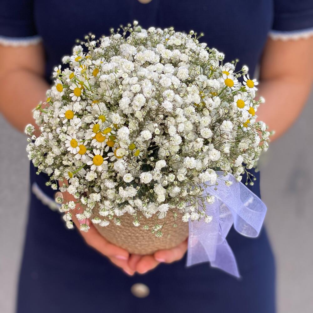 Гипсофила – 11 шт.Матрикария (Ромашка Камила) – 3 шт.кашпо джутовое ручной работы – 1 шт.Лента органза – 1 шт.