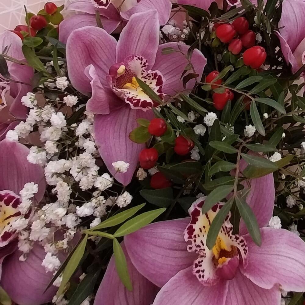 Орхидея Цимбидиум розовая – 9 шт.Хиперикум красный – 5 шт.гипсофила белая – 2 шт.фисташка зелень – 15 шт.Упаковка дизайнерская – 3 шт.