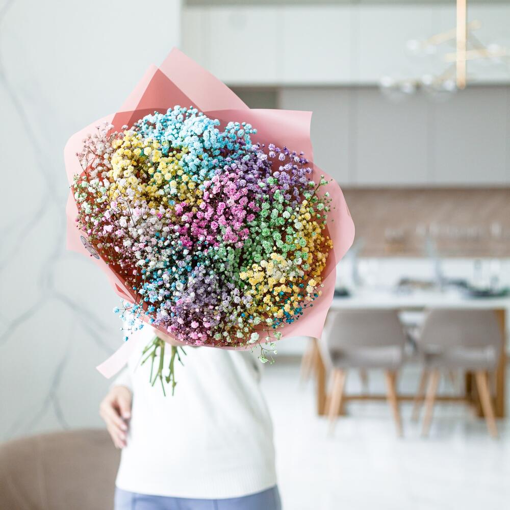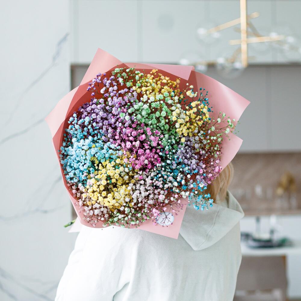 Шикарный букет из воздушной гипсофилы. Ни одна дама, точно не останется равнодушной при виде такой радуги .Инструкция по уходу за цветами прикреплена к каждому заказу.Цветы гипсофилы отличаются стойкостью и даже при высыхании не теряют, декоративности и цвета. Что позволяет, долгое время украшать интерьер в качестве сухоцветов.Подпишем открытку с вашими пожеланиями бесплатно