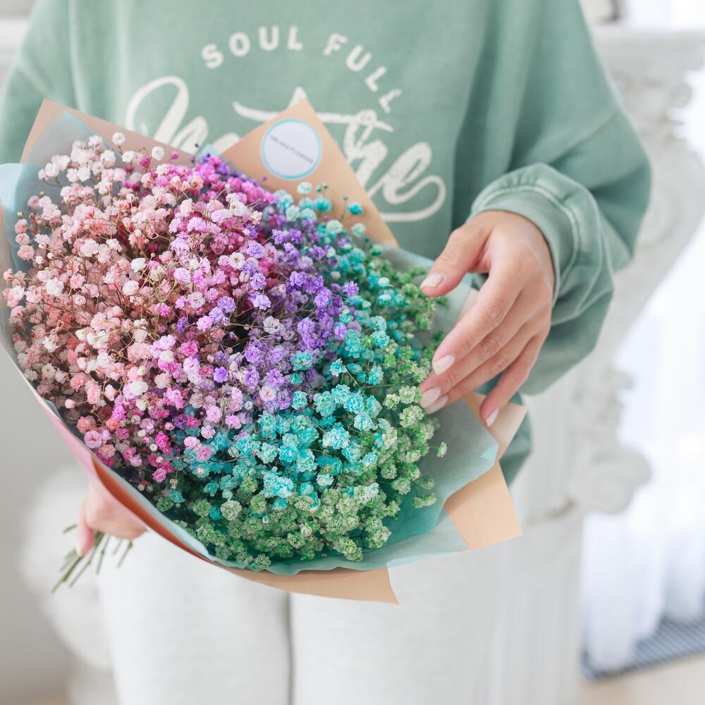 Лента атласная – 1 шт.Упаковка корейская пленка – 2 шт.инструкция по уходу за цветами – 1 шт.упаковка транспортировочная – 1 шт.гипсофила цветная микс – 7 шт.