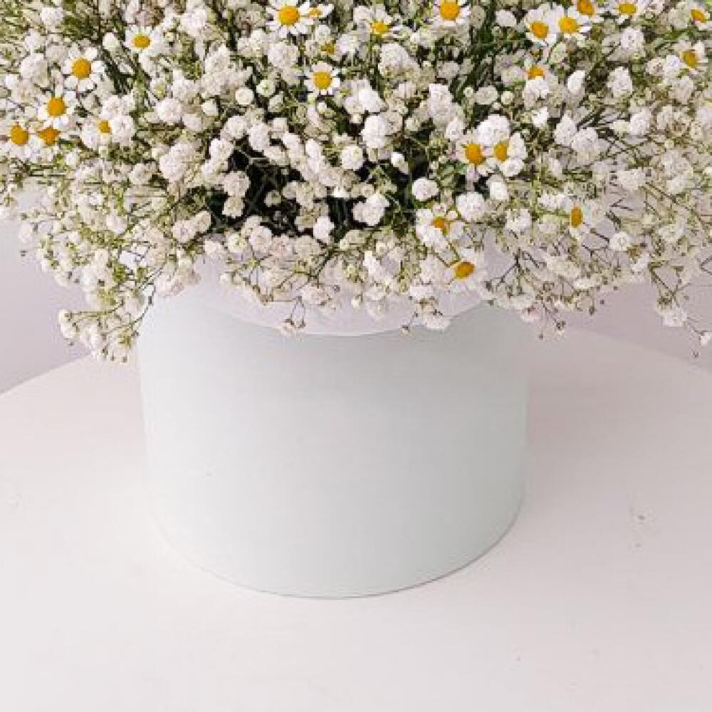 Гипсофила – 7 шт.Ромашка кустовая – 7 шт.Шляпная коробка – 1 шт.Тишью – 1 шт.