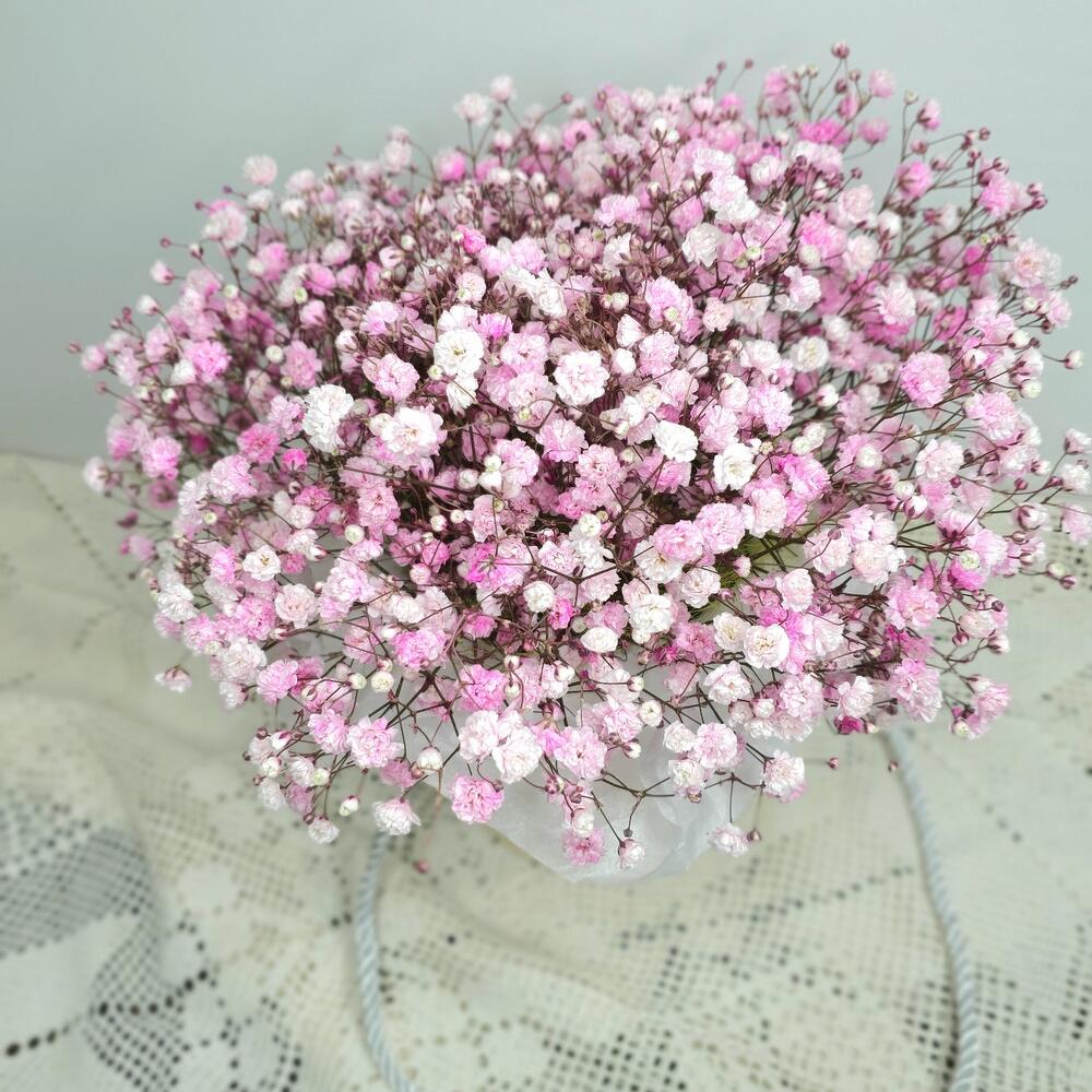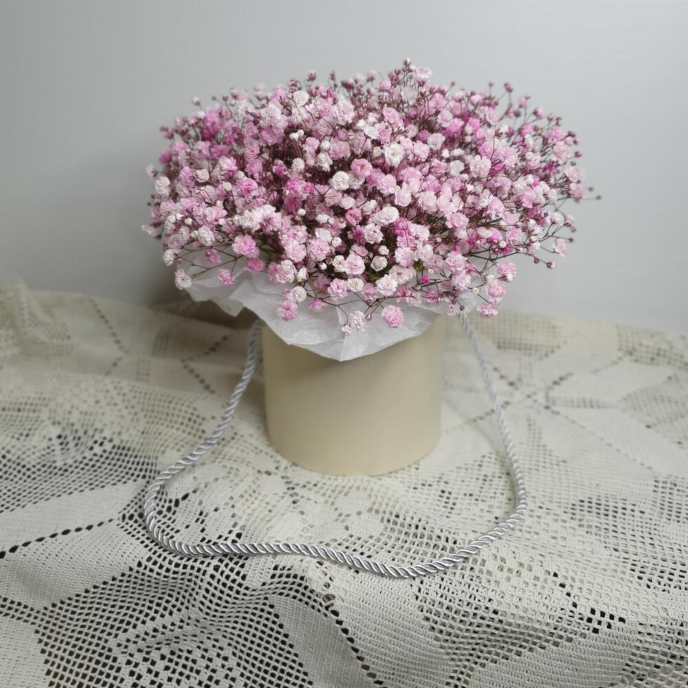 Гипсофила – 5 шт.Шляпная коробка – 1 шт.Тишью – 1 шт.Флористическая губка – 1 шт.