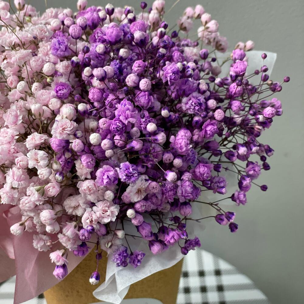 «Лавандовое созвездие» Букет из розы, гвоздики, статица и хлопка