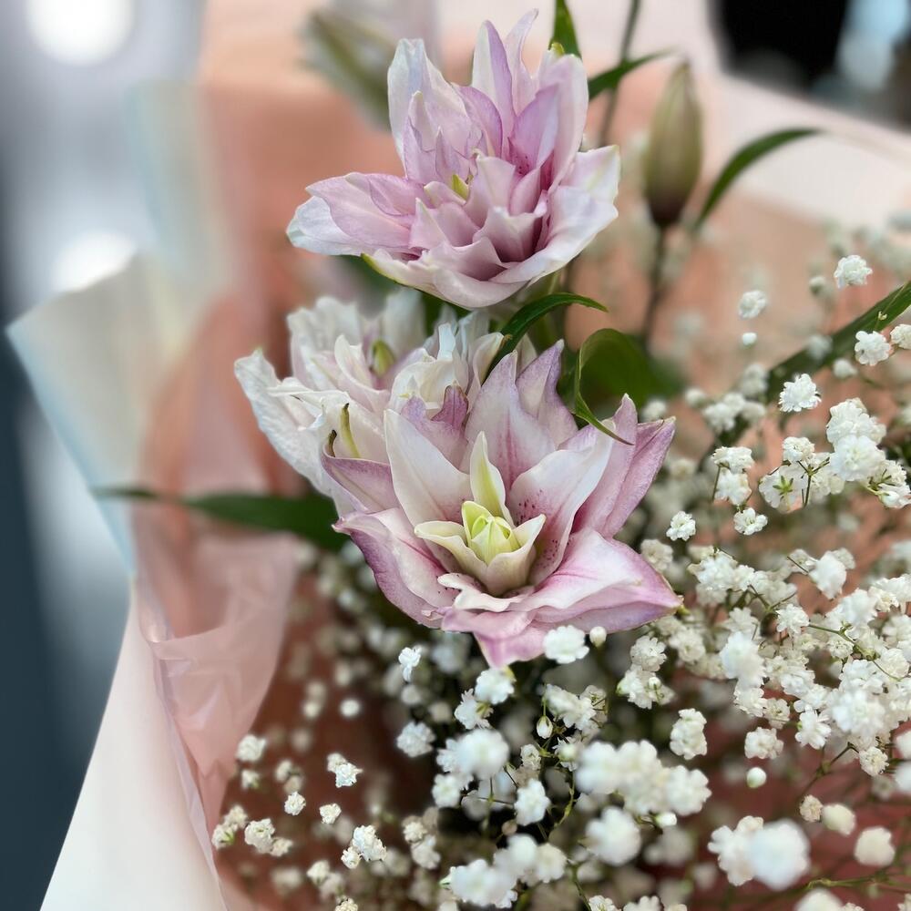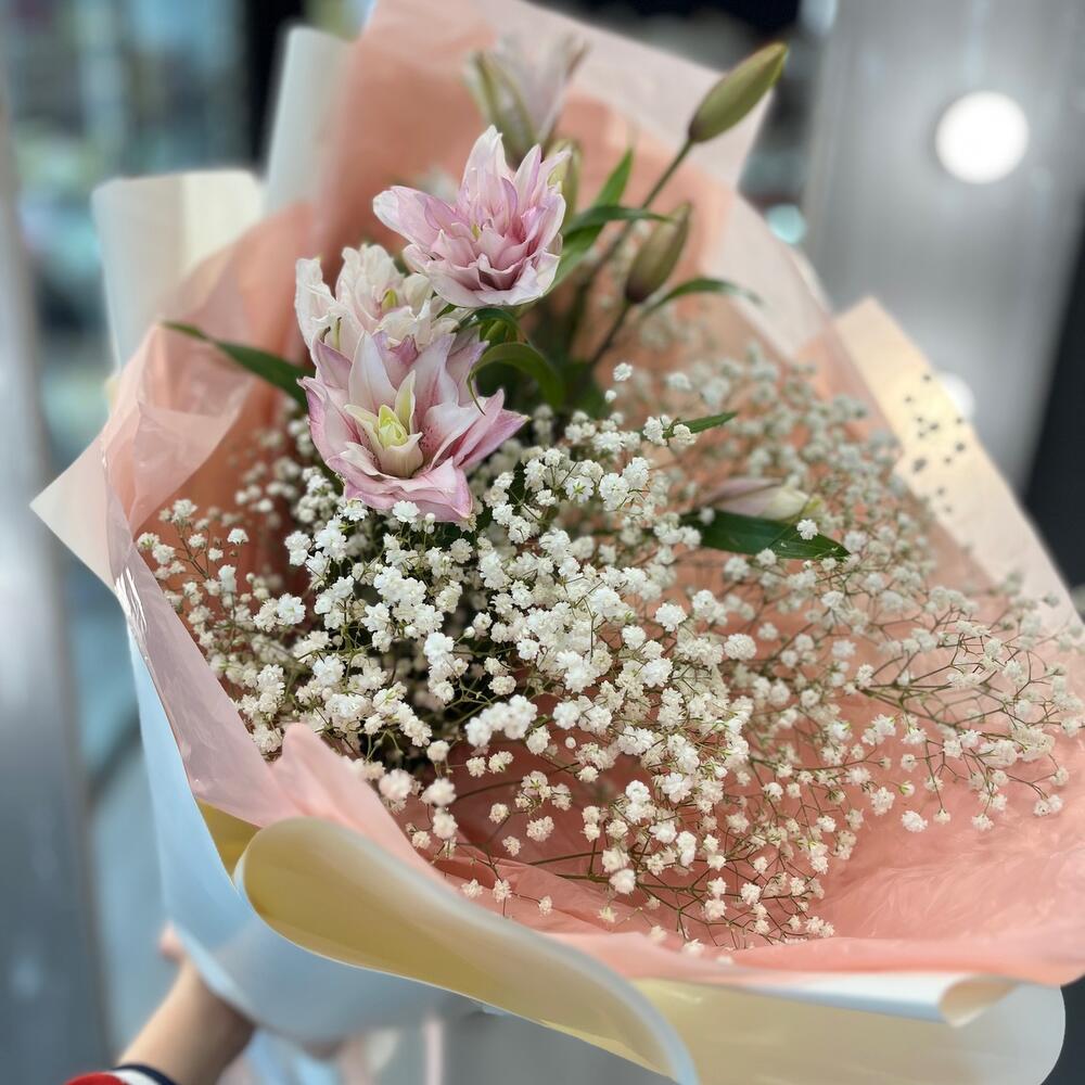 Гипсофила – 5 шт.Лента – 2 шт.Лилия – 1 шт.Упаковка дизайнерская – 3 шт.
