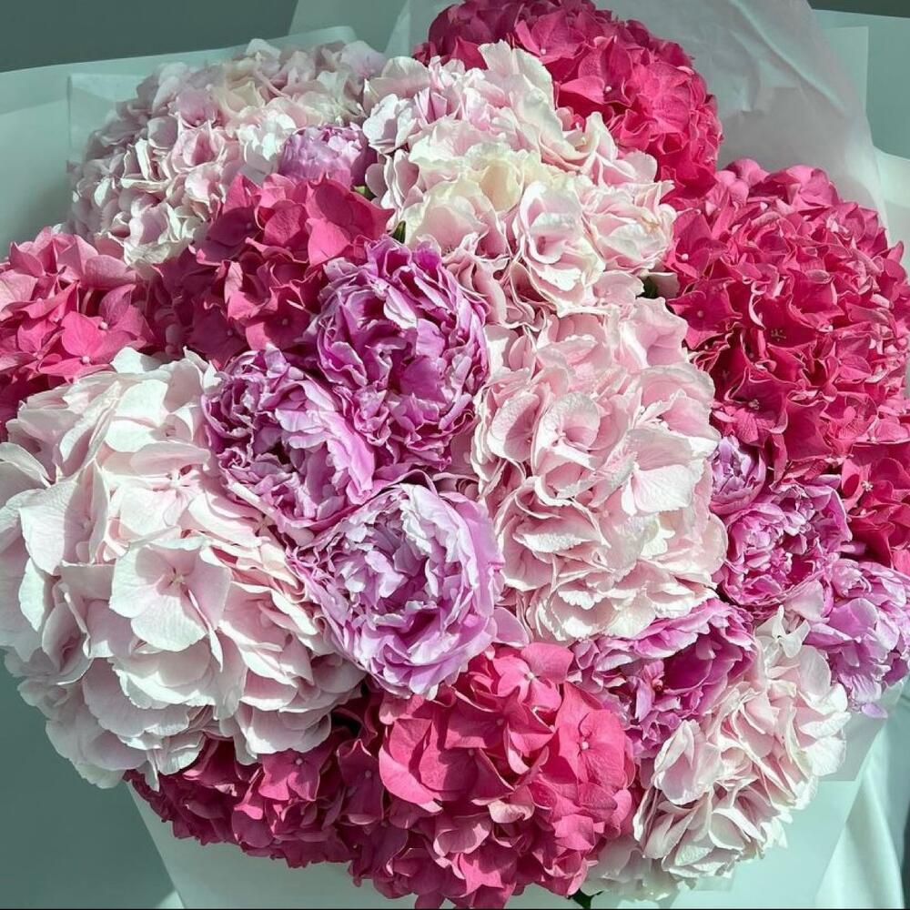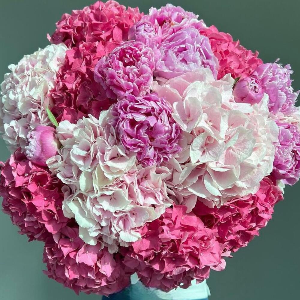 Пион – 9 шт.гортензия ассорти – 14 шт.Упаковка дизайнерская – 1 шт.Лента атласная – 2 шт.Открыточка с вашими пожеланиями – 1 шт.хорошее настроение – 100 шт.инструкция по уходу за цветами – 1 шт.коробка переноска – 1 шт.Кризал – 1 шт.