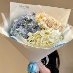 Букет из гортензии, эустомы, роз, диантуса и статицы в стильной упаковке "Балинезия"
