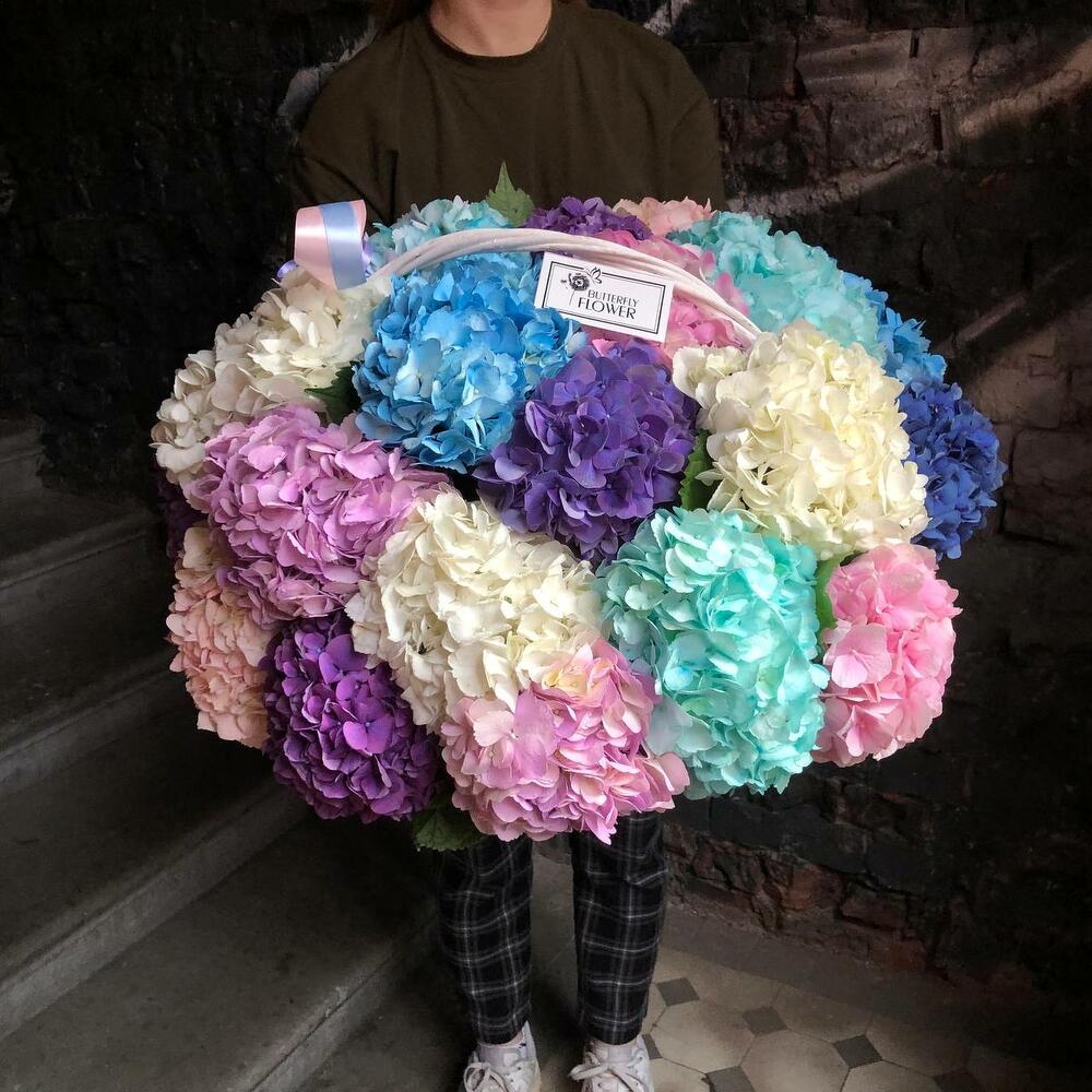 Корзина из 25 огромных гортензий «Летняя мозаика»