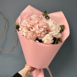 Пион – 3 шт.Эвкалипт – 2 шт.Лента атласная – 1 шт.Тишью – 2 шт.Упаковка дизайнерская – 2 шт.Гортензия розовая – 1 шт.