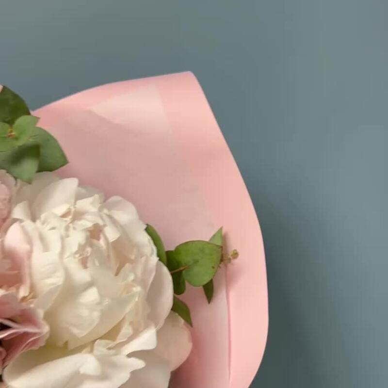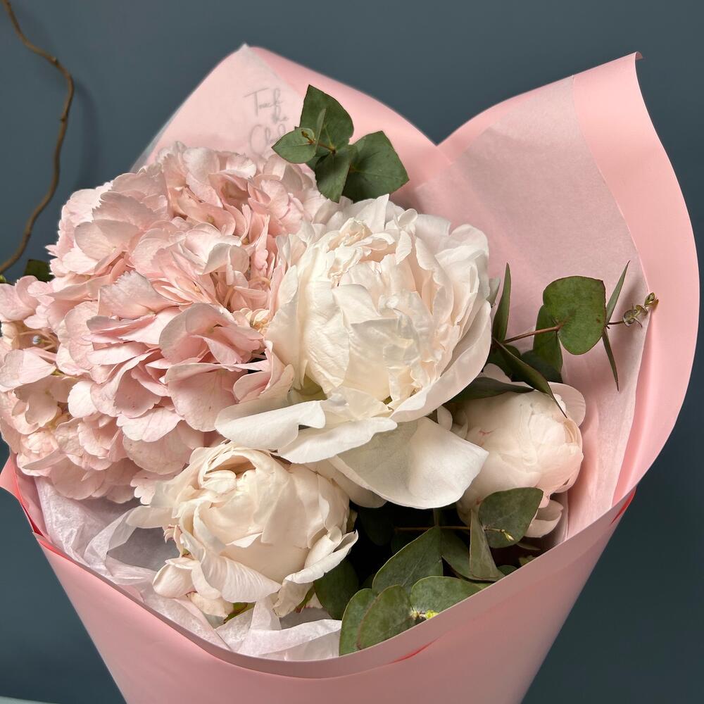 Розовая гортензия и нежные пионы с эвкалиптом в розовой упаковке