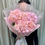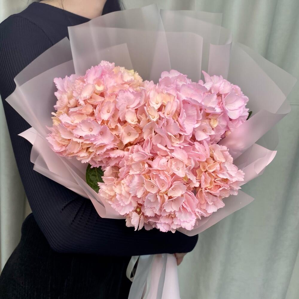 Гортензия – 3 шт.Лента атласная – 1 шт.Пленка матовая – 1 шт.Открыточка с вашими пожеланиями – 1 шт.