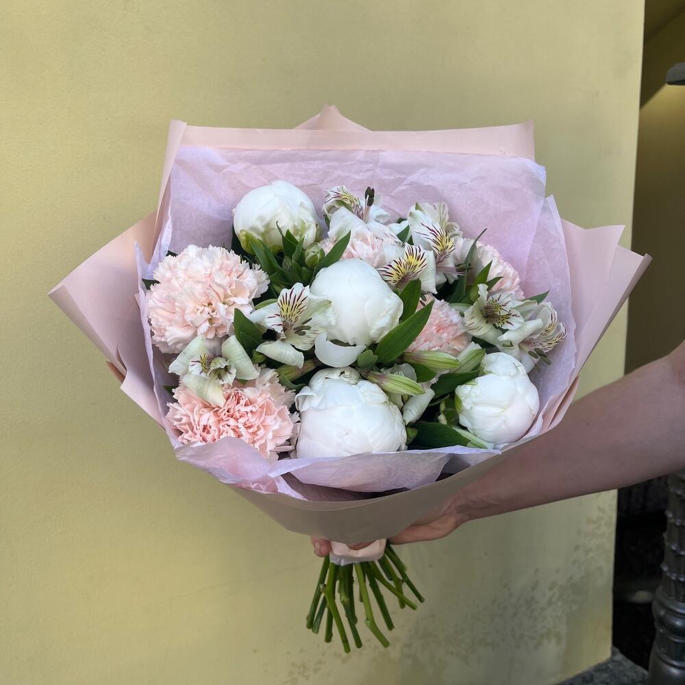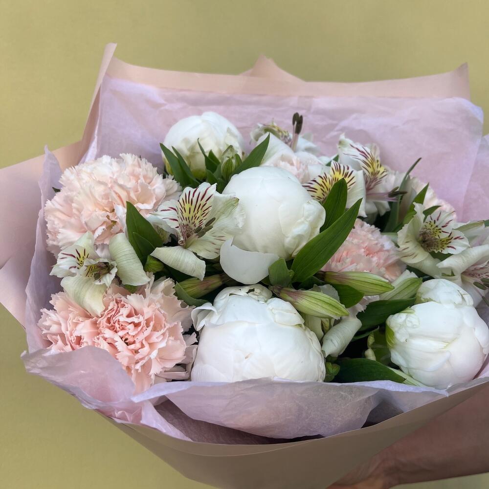 Альстромерия белая – 6 шт.Лента атласная белая – 1 шт.Диантус персиковый – 5 шт.Упаковка корейская пленка – 1 шт.пион белый премиум – 5 шт.тишью нежно-розовое – 1 шт.