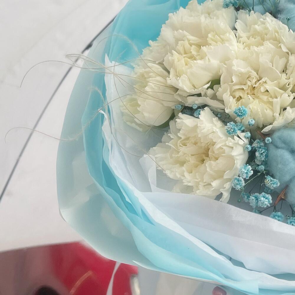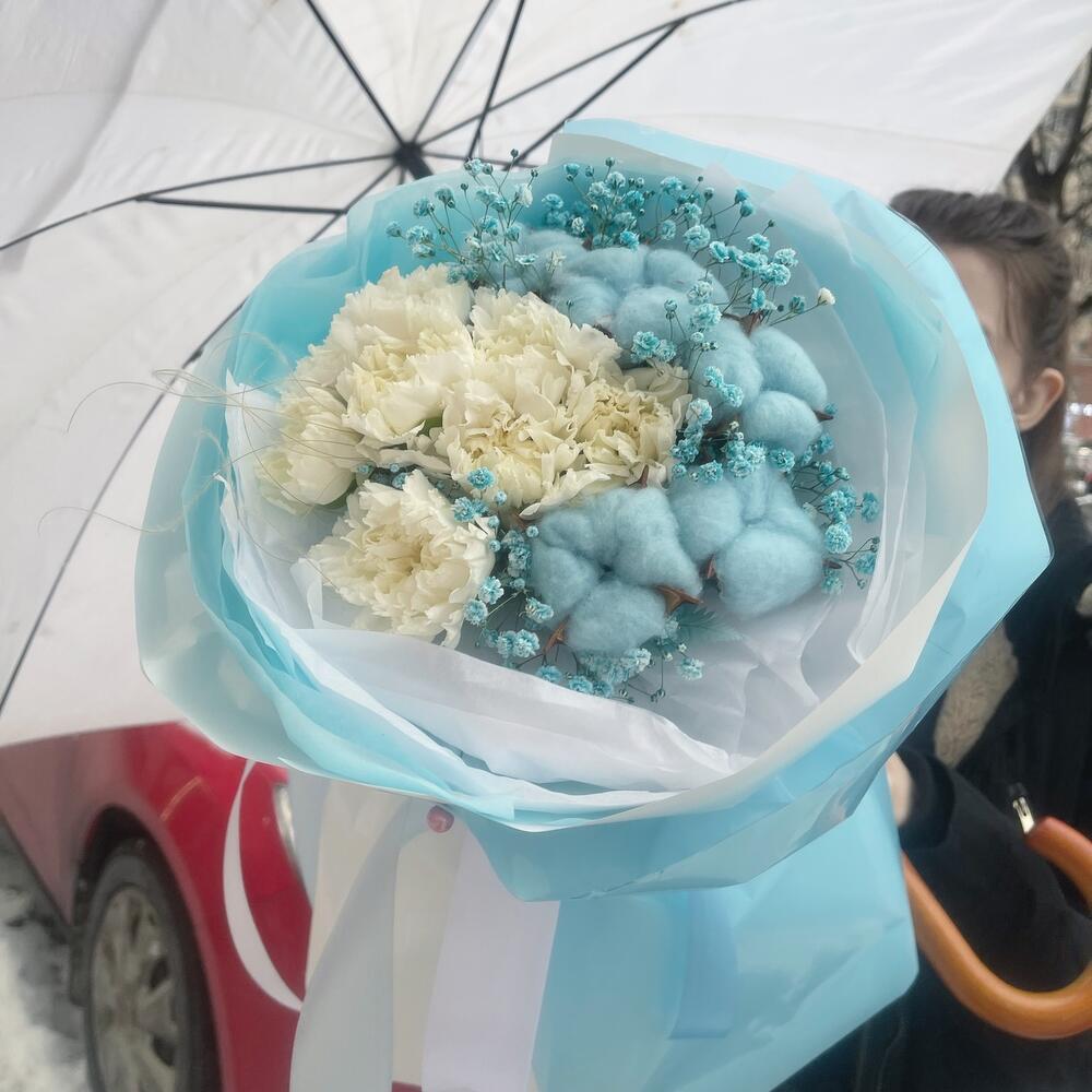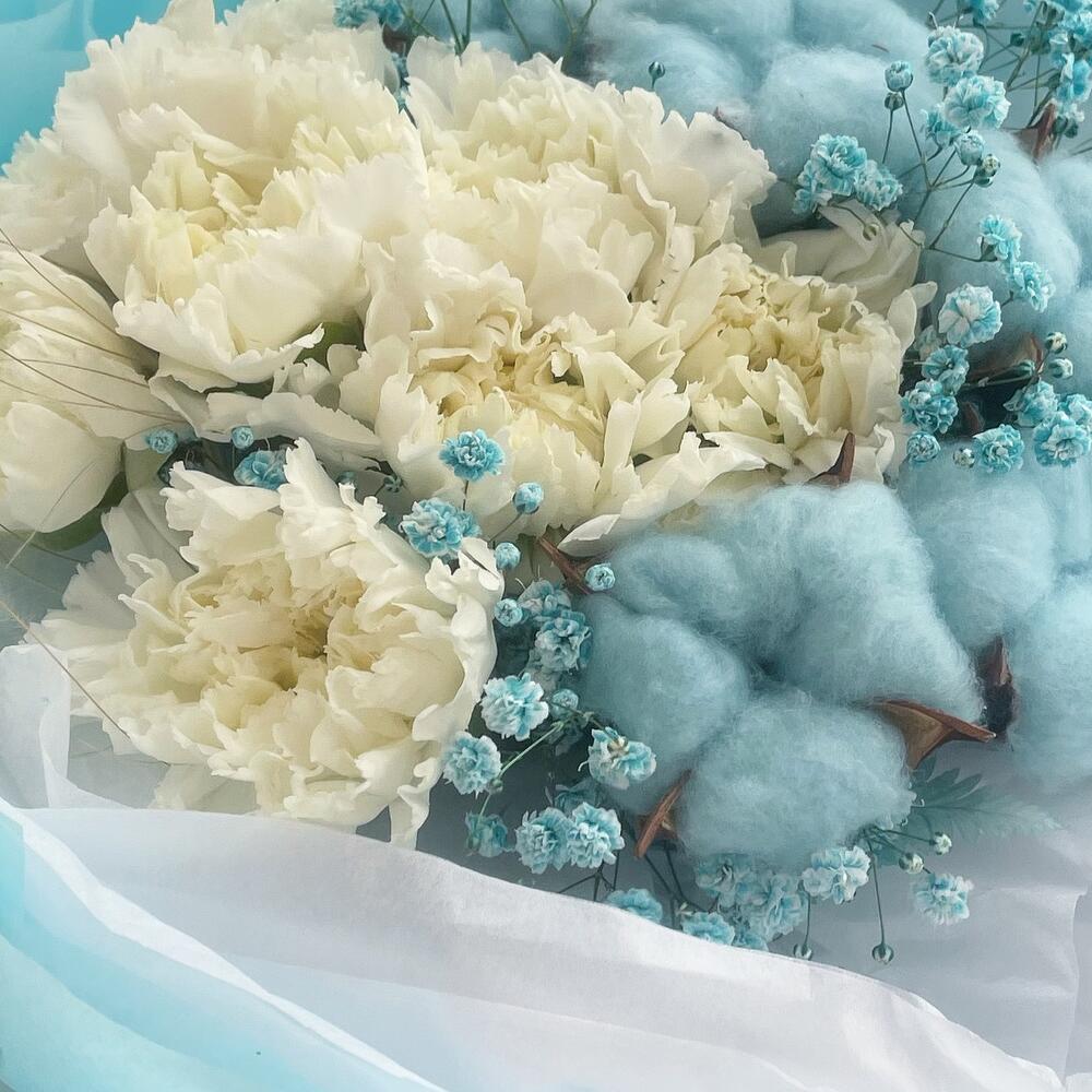Гипсофила – 1 шт.Лента атласная – 2 шт.Тишью – 6 шт.Диантус – 9 шт.Пленка – 4 шт.Хлопок натуральный – 5 шт.стифа сухая – 5 шт.