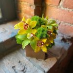 Букет из орхидей и диантуса в деревянном ящике “Изысканный зеленый”