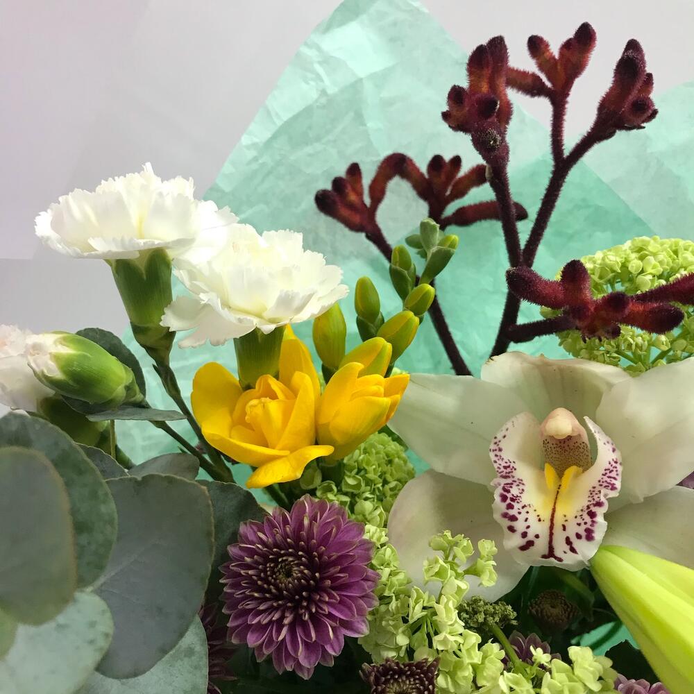 Пион – 1 шт.Орхидея Цимбидиум – 2 шт.Вибурнум – 3 шт.Гвоздика кустовая – 1 шт.Сантини – 2 шт.Фрезия – 2 шт.Анигозантус – 1 шт.Эвкалипт цинерея – 1 шт.Лента атласная – 1 шт.Упаковка дизайнерская – 1 шт.Открыточка с вашими пожеланиями – 1 шт.