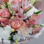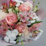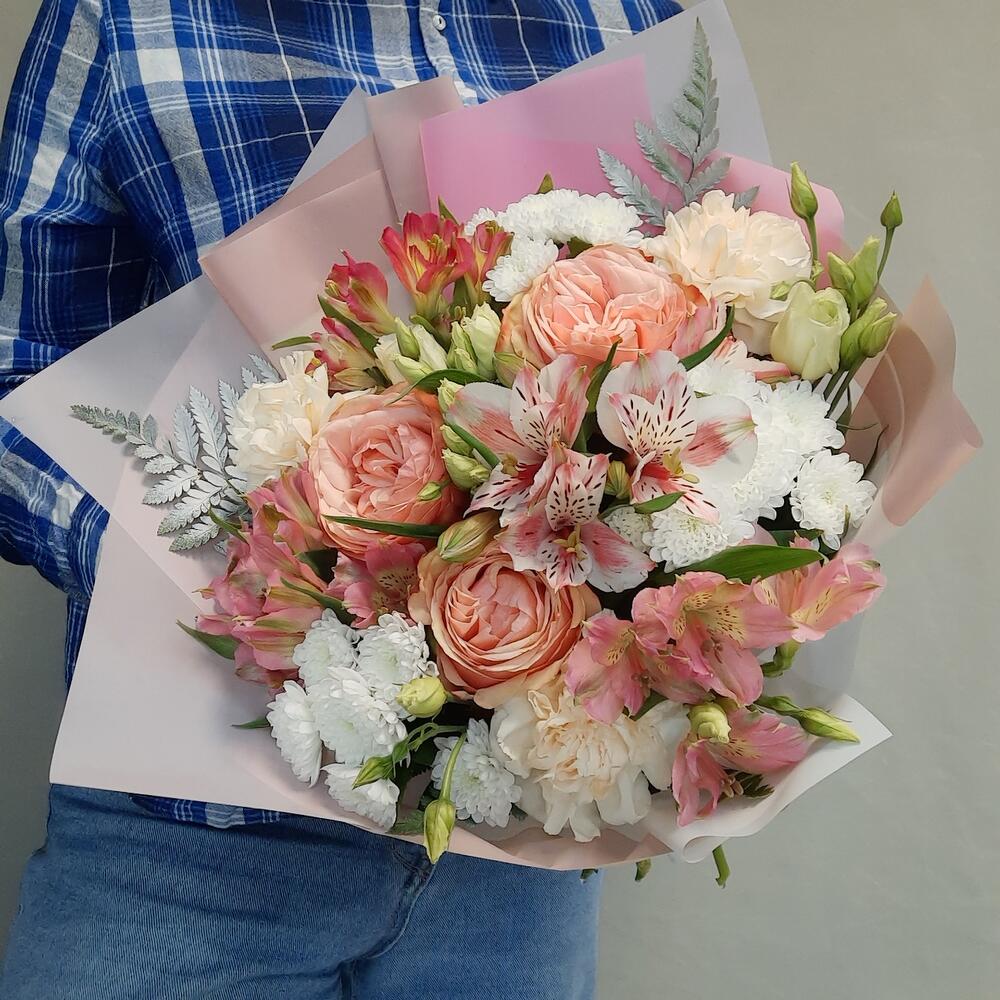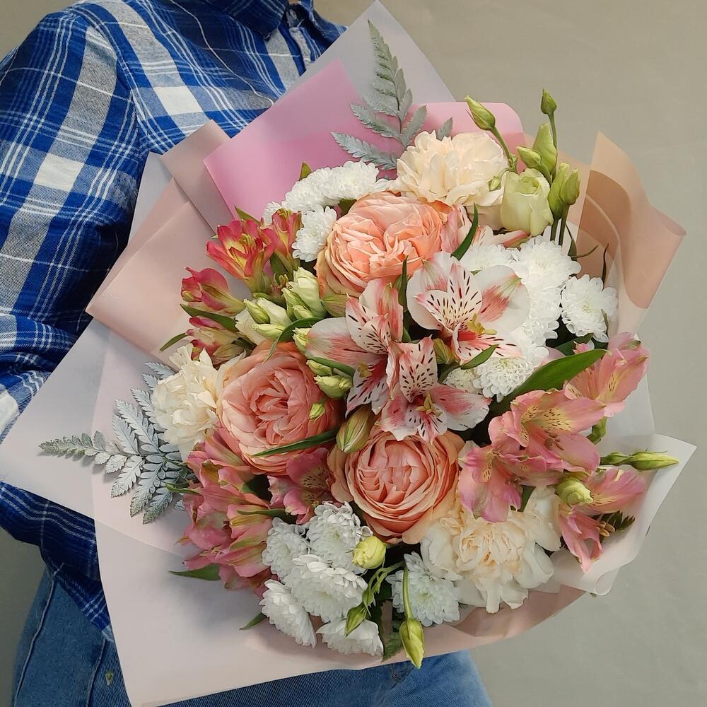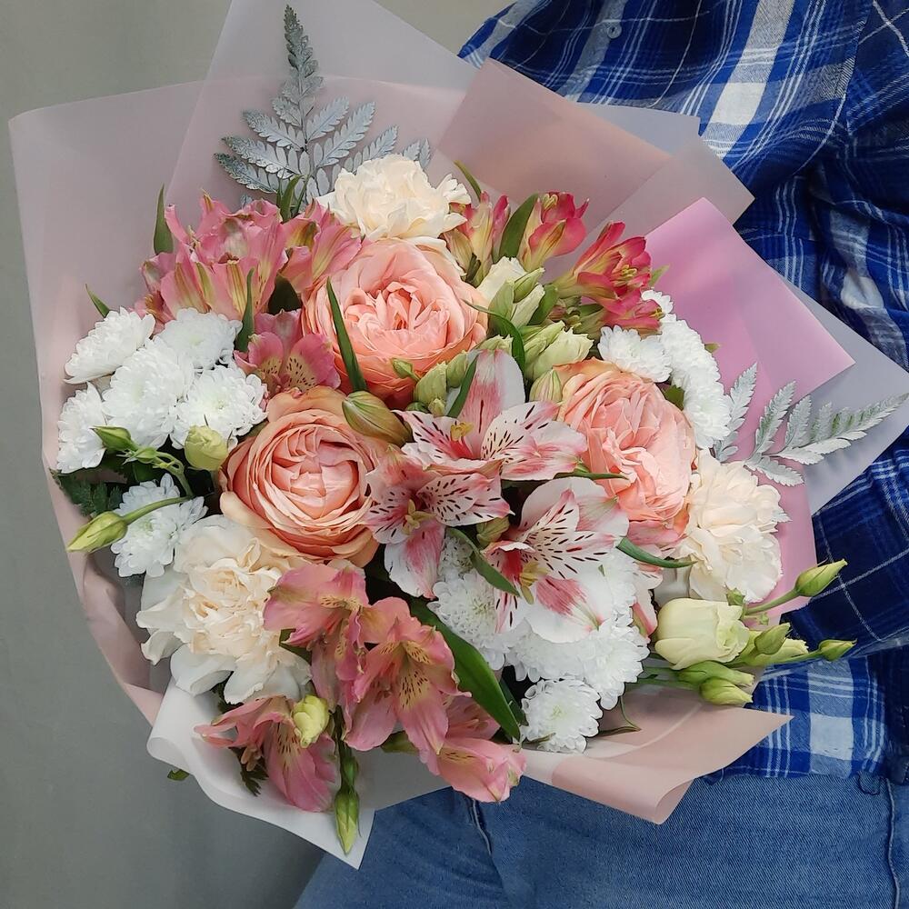 Нежный букет из розы, альстромерии, эустомы в стильной упаковке