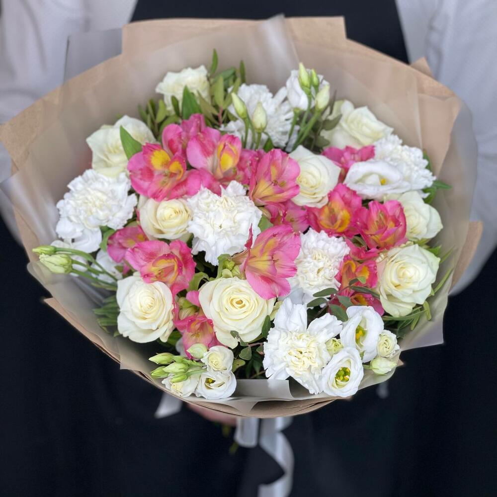 Категории: АльстромерииРозы, Гвоздики, Лизиантусы