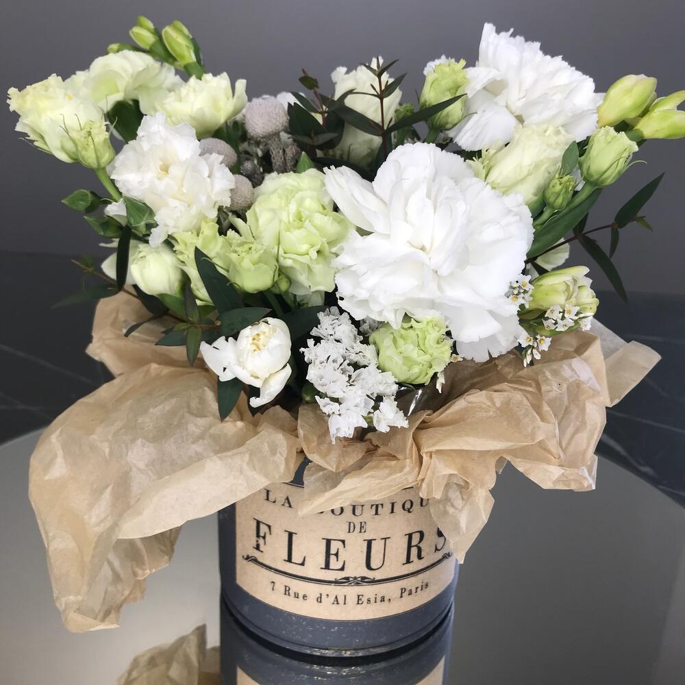 Лизиантус – 1 шт.Фрезия – 2 шт.Гвоздика – 2 шт.Гвоздика кустовая – 2 шт.Жестяное кашпо – 1 шт.комплимент от polyanka – 1 шт.