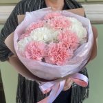 Лента атласная – 2 шт.Тишью – 1 шт.Диантус белый – 7 шт.Упаковка корейская пленка – 1 шт.диантус нежно-розовый – 10 шт.